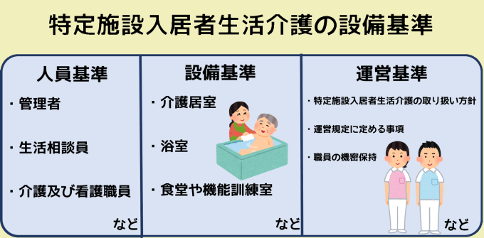 特定施設入居者生活介護の事業者として指定を受けるには、厚生労働省令で定められた人員基準や設備基準、運営基準をクリアする必要があります。