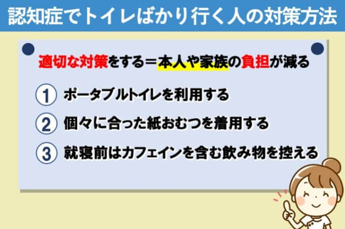 負担が大きくなる行動・心理症状(BPSD)の中でも、徘徊や頻尿などの排泄トラブルは、本人の身体の状態や環境で出現を抑えることが出来ます。本人だけでなく、家族の負担も軽減できるようにきちんと対策をとることが大切です。具体的にどのような対策をとればいいのか、3つの対策方法について紹介していきます。