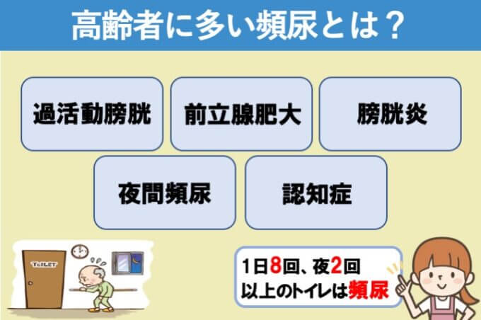 一般的な排尿の回数は、1日4~6回、夜は0~1回です。そのため、1日8~10回、夜は2回以上となると頻尿となります。高齢者に多い頻尿の種類としては主に5つあります。