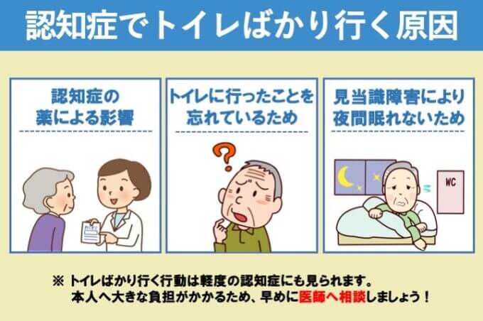 認知症になり、トイレばかり行くという行動には原因があります。また、認知症の進行にあわせて症状が出てくるわけではなく、軽度の認知症の方にも見られます。