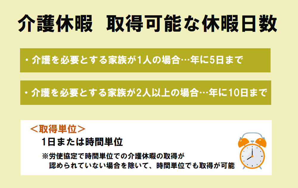 | 要介護状態にある家族(親か祖父母、兄弟姉妹、子、孫、配偶者、配偶者の父母)が1人の場合、1年に5日まで取得可能。 (対象家族が2人以上の場合は、年10日まで取得可能) | 上限回数は3回、上限日数は93日取得可能。 |