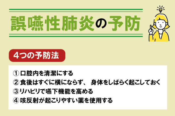誤嚥性肺炎の予防方法について説明します。予防方法としては、以下の4つが挙げられます。