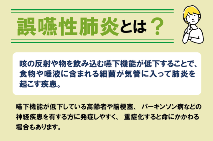 誤嚥性肺炎とは、咳の反射や物を飲み込む嚥下機能が低下することで、食物や唾液に含まれる細菌が気管に入って肺炎を起こす疾患を指します。嚥下機能が低下している高齢者や脳梗塞、パーキンソン病などの神経疾患を有する方に発症しやすく、重症化すると命にかかわる場合もあります。高齢者や全身状態が不良な方では、口腔内のケアが不十分で細菌が多く増殖していることがあり、誤嚥性肺炎のリスクが高まります。