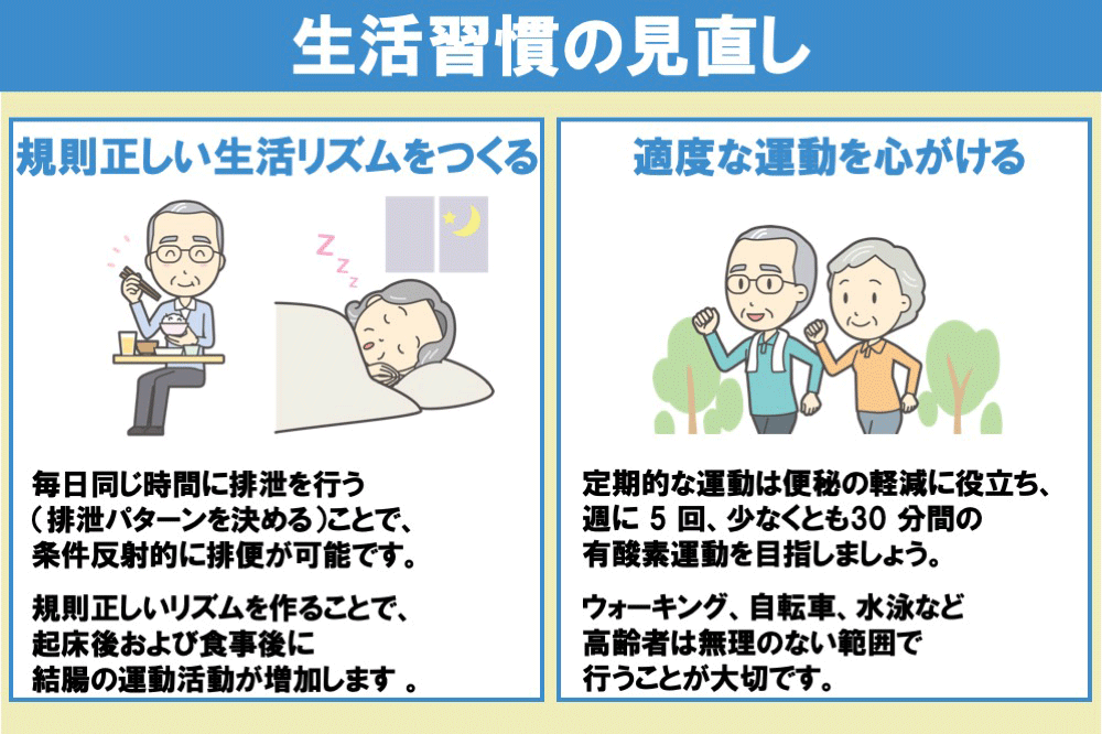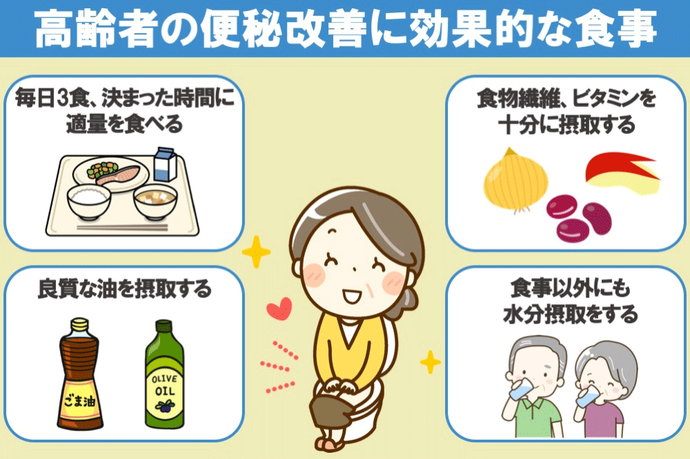 では、高齢者に対する便秘の対処方法として、どのようなものがあるでしょうか。対処方法として、便秘に効果的な食生活を取り入れることや、生活習慣を見直すことが挙げられます。それぞれについて詳しく説明します。