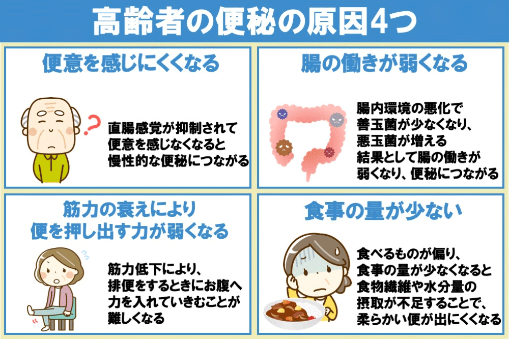 また、腸の働きが弱くなることも高齢者の便秘の原因となります。