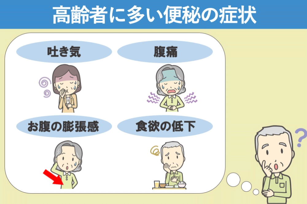 高齢者に多い便秘の症状としては、下腹部痛や腹部膨満感、吐き気、嘔吐、残便感などがあります。腸に便が溜まることで、便を押し出そうと腸の蠕動運動が亢進し、下腹部痛が生じます。また、便が溜まることで腸のガスも溜まりやすくなり、腹部膨満感が出現し、腹部膨満感により嘔気や嘔吐が出現します。