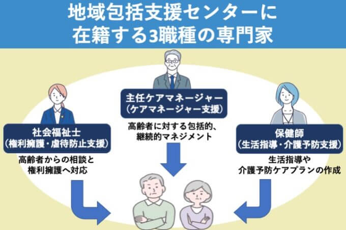 このように、地域包括支援センターにはそれぞれの専門分野に特化したスペシャリストが在籍しています。それぞれの専門性を活かし、うまく連携をとりながら高齢者のサポートへつなげているのです。