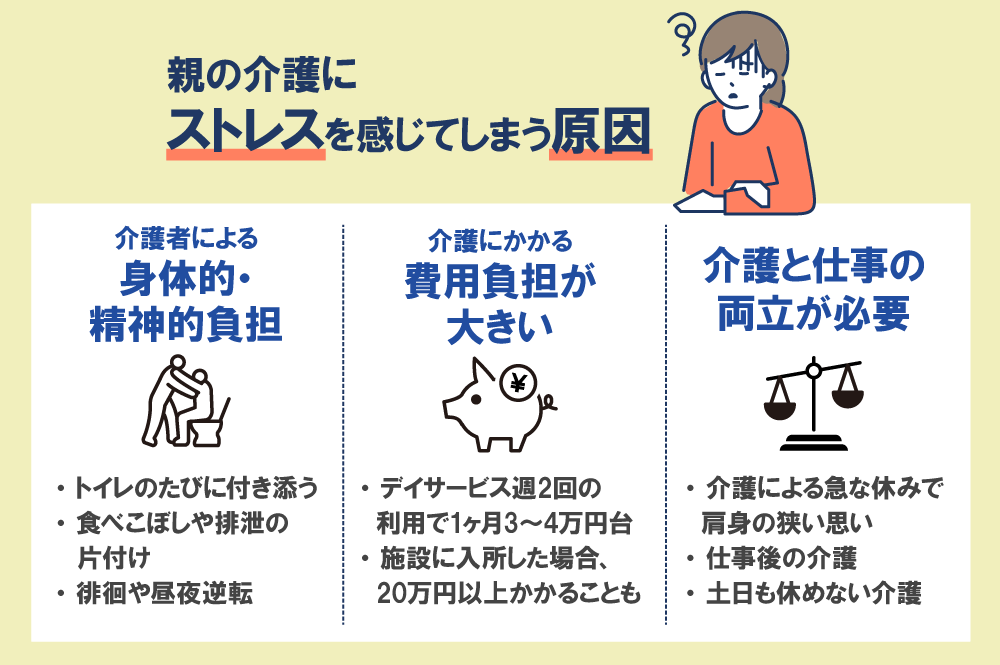 「外で仕事を頑張って、帰ると親の介護」「仕事がお休みでも介護は休めないので、気を抜く暇もない」、そんな毎日を送っていませんか? 仕事と介護の両立はむずかしいものです。大事だからこそ自分で面倒を見てあげたいけれど、親だからこそイライラしてしまうこともあるでしょう。ストレスの溜めこみすぎはゆくゆく身体の不調につながります。介護のストレスを軽減することで自分と家族との大切な生活を続けていくことができます。今回は、ストレスを軽減するための方法を紹介していきます。