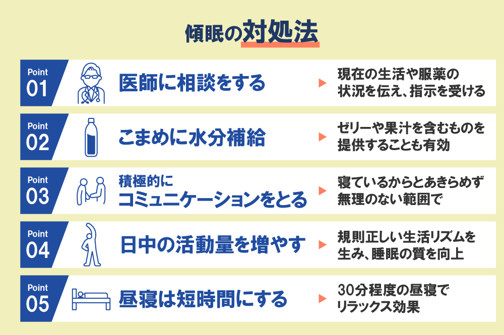 傾眠傾向は、認知症などの重大な病気が原因となっている場合があります。まずは主治医に相談するのがよいでしょう。また、薬の副作用が原因の可能性もあります。医師の判断によっては、薬剤の見直しも行われるかもしれません。まずは現在の生活や服薬の状況を主治医に伝え、治療や介護の指示を受けましょう。
