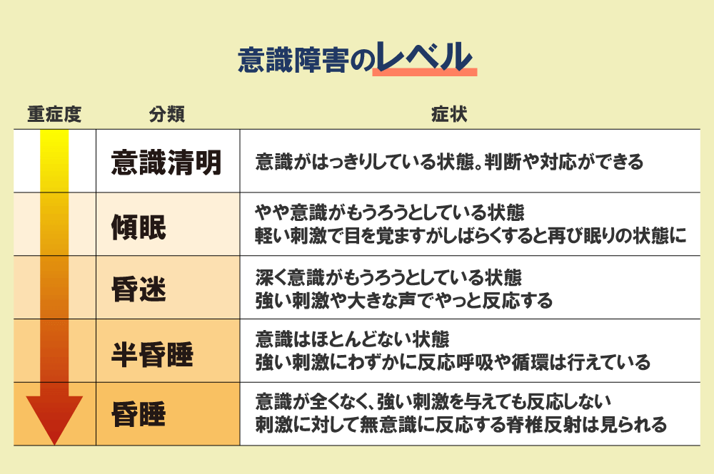 傾眠傾向は、意識障害の一種です。意識レベルは、「意識清明」「傾眠」「昏迷」「半昏睡」「昏睡」の5段階に分けられます。