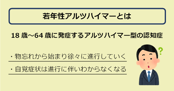 若年性アルツハイマーとは、18歳~64歳の人に生じる認知症です。原因は、明確にはわかっていませんが、脳が萎縮し、脳に異常な蛋白質が蓄積することが原因 と考えられています。若年性アルツハイマーは、65歳以上に見られる老年性のアルツハイマーに比べて、症状の進行スピードが速いのが特徴です。