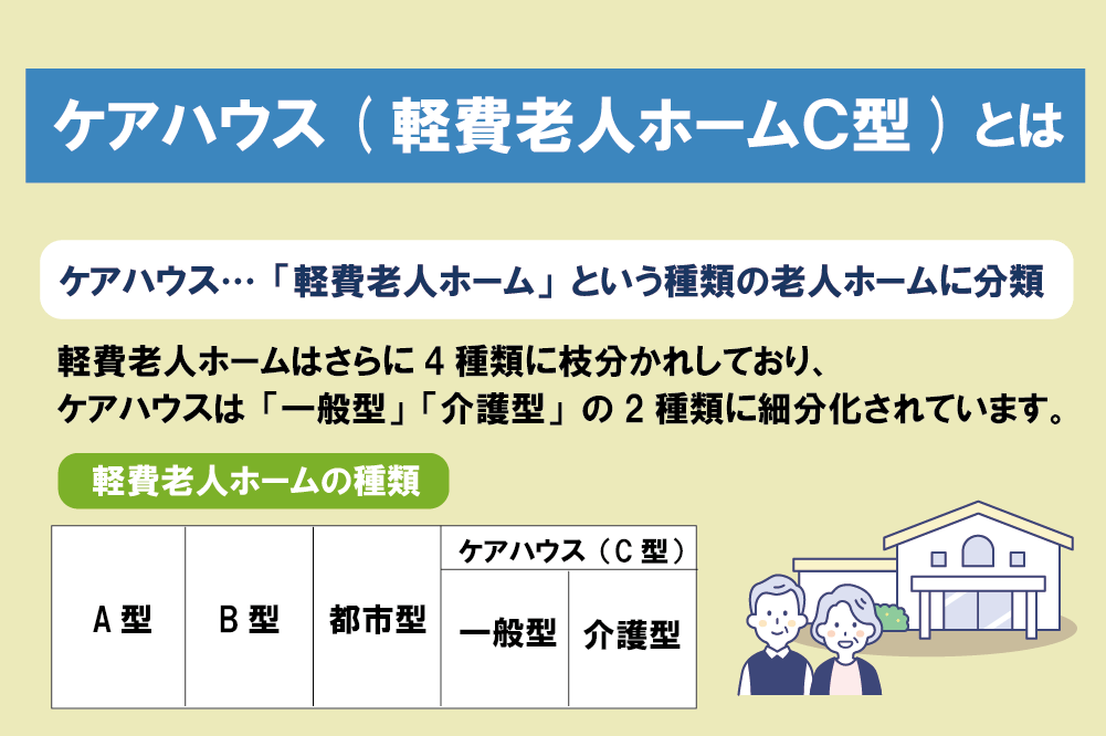 ケアハウスとは、「軽費老人ホーム」という種類の老人ホームに分類されています。軽費老人ホームはさらに4種類に枝分かれしており、ケアハウスはその中の「軽費老人ホームC型」に該当します。さらにケアハウスは「一般型」「介護型」の2種類に細分化されています。詳しくは下表をご覧ください。