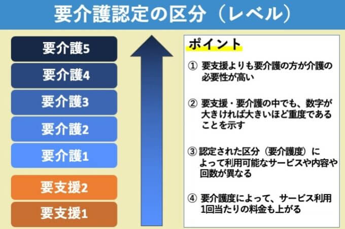 要介護認定は「自立(非該当)」「要支援1・2」「要介護1~5」に分かれています。「自立(非該当)」は介護保険制度の対象外という意味の判定で、一部のサービスを除いて介護保険制度を利用することはできません。要支援と要介護のポイントは以下の4つです。