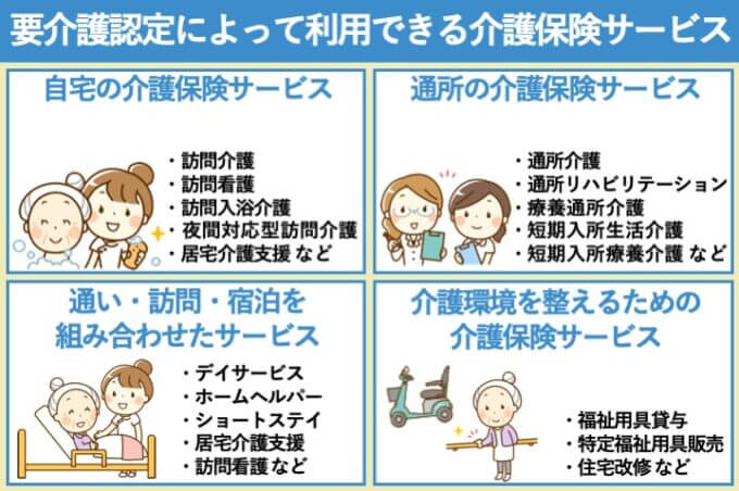 要介護認定によって利用できるサービスのうち、自宅で生活している方が利用できるサービスを大きく分けると以下の4種類に分類できます。