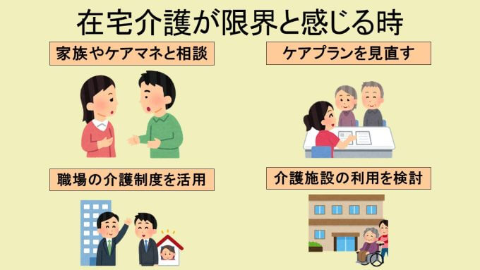 この章では、在宅介護が限界と感じたときはどうすればいいのか、具体的な対策を4つご紹介していきます。