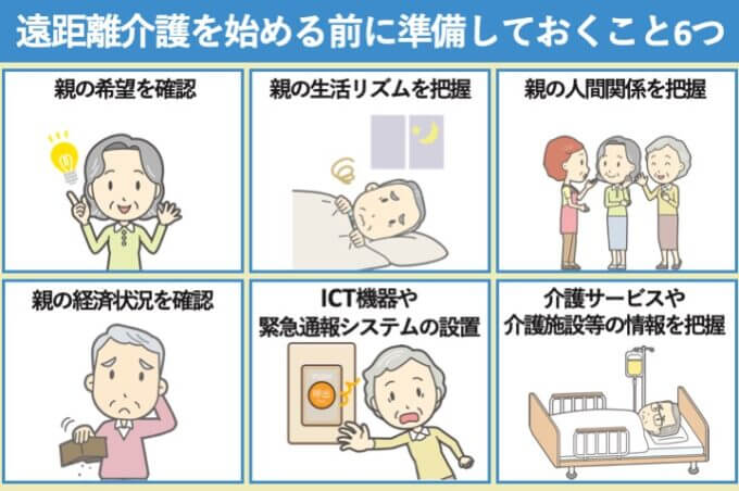 遠距離介護では親の顔を常に見られない分、心配ごとも多いものです。しかし事前に確認や準備をすることで、不安な点を解消できることもあります。また見守りサービスなどを活用すれば、介護負担を減らすことも可能です。ここでは、遠距離介護を始める前に準備しておくべきことを6つご紹介します。