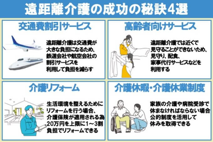 介護保険サービスを利用しても、それだけで全てをカバーするのは難しいケースもあります。ここでは、遠距離介護の成功に欠かせない秘訣4つを紹介します。