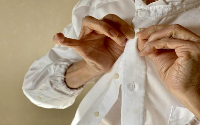 ボタンエイドとは、ボタンを留めるために使用する自助具です。ボタンエイドの先端部分を、洋服に付いているボタンの穴へ差し込みボタンにかけます。あとはボタンエイドを引っ張ることで、ボタンを留めることができます。リウマチや脳性麻痺などで手指の細かい動きが難しい人指先の握り持つ力が低下している人、頻繁にTシャツを着る必要がある人にはとても便利です。