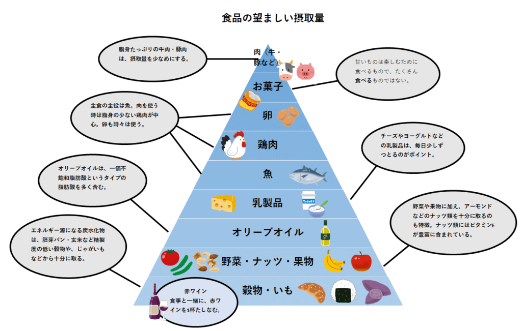 さまざまな健康効果が期待できると注目を集めている、地中海式ダイエット。日本でも紹介され、近年ブームになっているダイエット方法です。ギリシャやイタリア南部などに住む方は、古くから慢性疾患がなく長寿でした。これらのエリアに住む方は、野菜や果物、魚、ナッツ、オリーブオイル、赤ワインなどを食事でとっていたため、これが健康の秘訣と考えられています。地中海ダイエットでは、肉より魚をメインに食べ、オリーブオイルやアボカドなど良質な脂肪分も摂取します。